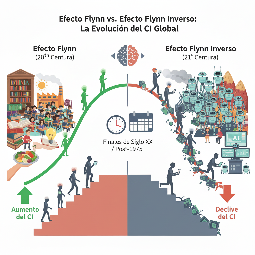 El investigador James Flynn publicó en 1984 un estudio en el que concluyó que el coeficiente intelectual (CI) de los humanos incrementó 3 puntos por década entre los años 1930 y 1980, a lo que se llamó “El Efecto Flynn” (EF). Un estudio posterior en Noruega descubrió un punto de inflexión, a lo que se llamó “Efecto Flynn Inverso” (EFI), y evidenció como entre 1980 y 2018, en los países desarrollados, el CI ya no subía sino que descendía.